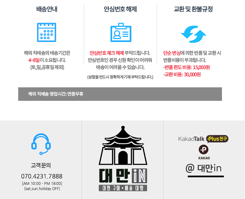 ㆍ반품 및 교환시 해외 배송 특성상 배송이 10일 이상 걸리는 점 양해 부탁드립니다.